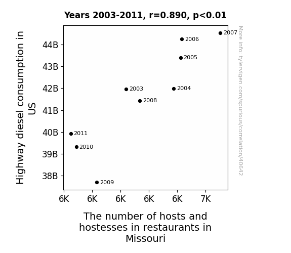 This means 79.2% of the change in the one variable (i.e., The number of hosts and hostesses in restaurants in Missouri) is predictable based on the change in the other (i.e., Highway diesel consumption in US) over the 9 years from 2003 through 2011.