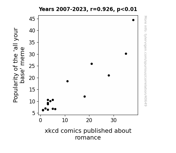 This means 85.8% of the change in the one variable (i.e., xkcd comics published about romance) is predictable based on the change in the other (i.e., Popularity of the 'all your base' meme) over the 17 years from 2007 through 2023.