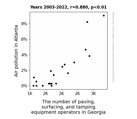 This means 77.4% of the change in the one variable (i.e., The number of paving, surfacing, and tamping equipment operators in Georgia) is predictable based on the change in the other (i.e., Air pollution in Atlanta) over the 20 years from 2003 through 2022.