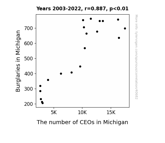 This means 78.7% of the change in the one variable (i.e., The number of CEOs in Michigan) is predictable based on the change in the other (i.e., Burglaries in Michigan) over the 20 years from 2003 through 2022.