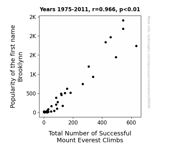 This means 93.2% of the change in the one variable (i.e., Total Number of Successful Mount Everest Climbs) is predictable based on the change in the other (i.e., Popularity of the first name Brooklynn) over the 37 years from 1975 through 2011.