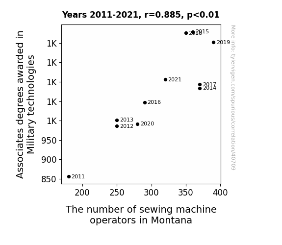 This means 78.4% of the change in the one variable (i.e., The number of sewing machine operators in Montana) is predictable based on the change in the other (i.e., Associates degrees awarded in Military technologies) over the 11 years from 2011 through 2021.