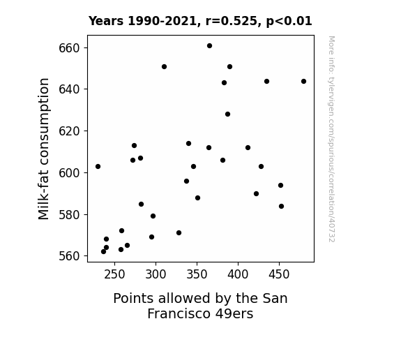 This means 27.6% of the change in the one variable (i.e., Points allowed by the San Francisco 49ers) is predictable based on the change in the other (i.e., Milk-fat consumption) over the 32 years from 1990 through 2021.
