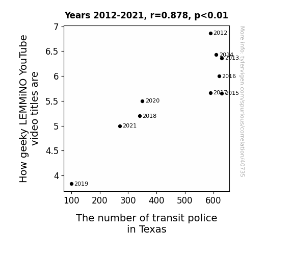 This means 77.2% of the change in the one variable (i.e., The number of transit police in Texas) is predictable based on the change in the other (i.e., How geeky LEMMiNO YouTube video titles are) over the 10 years from 2012 through 2021.