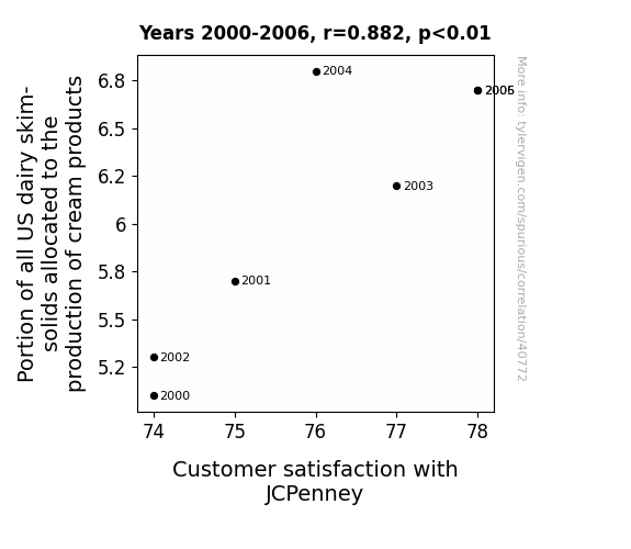 This means 77.9% of the change in the one variable (i.e., Customer satisfaction with JCPenney) is predictable based on the change in the other (i.e., Portion of all US dairy skim-solids allocated to the production of cream products) over the 7 years from 2000 through 2006.