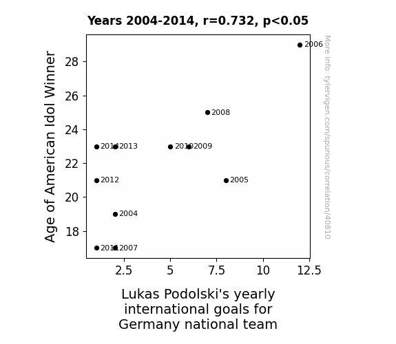 This means 53.5% of the change in the one variable (i.e., Lukas Podolski's yearly international goals for Germany national team) is predictable based on the change in the other (i.e., Age of American Idol Winner) over the 11 years from 2004 through 2014.