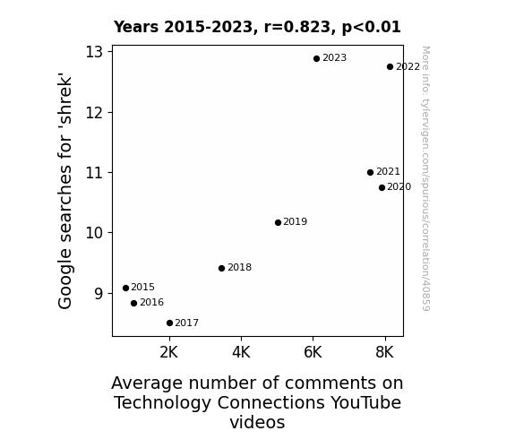 This means 67.7% of the change in the one variable (i.e., Average number of comments on Technology Connections YouTube videos) is predictable based on the change in the other (i.e., Google searches for 'shrek') over the 9 years from 2015 through 2023.