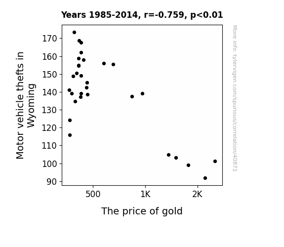 This means 57.6% of the change in the one variable (i.e., The price of gold) is predictable based on the change in the other (i.e., Motor vehicle thefts in Wyoming) over the 30 years from 1985 through 2014.