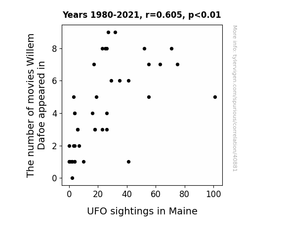 This means 36.6% of the change in the one variable (i.e., UFO sightings in Maine) is predictable based on the change in the other (i.e., The number of movies Willem Dafoe appeared in) over the 42 years from 1980 through 2021.