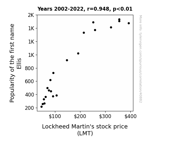 This means 89.8% of the change in the one variable (i.e., Lockheed Martin's stock price (LMT)) is predictable based on the change in the other (i.e., Popularity of the first name Ellis) over the 21 years from 2002 through 2022.
