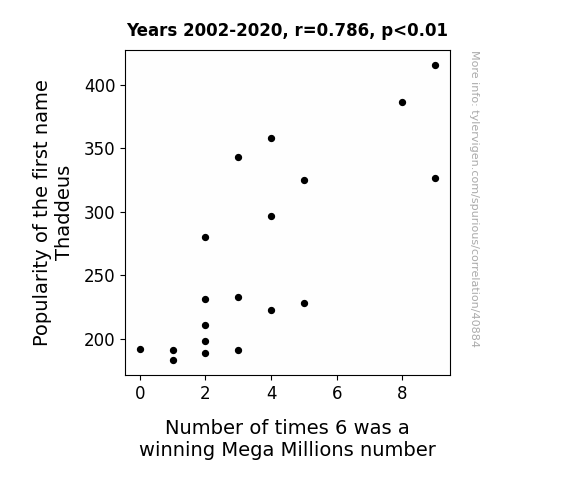 This means 61.7% of the change in the one variable (i.e., Number of times 6 was a winning Mega Millions number) is predictable based on the change in the other (i.e., Popularity of the first name Thaddeus) over the 19 years from 2002 through 2020.