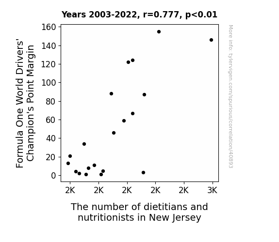 This means 60.3% of the change in the one variable (i.e., The number of dietitians and nutritionists in New Jersey) is predictable based on the change in the other (i.e., Formula One World Drivers' Champion's Point Margin) over the 20 years from 2003 through 2022.