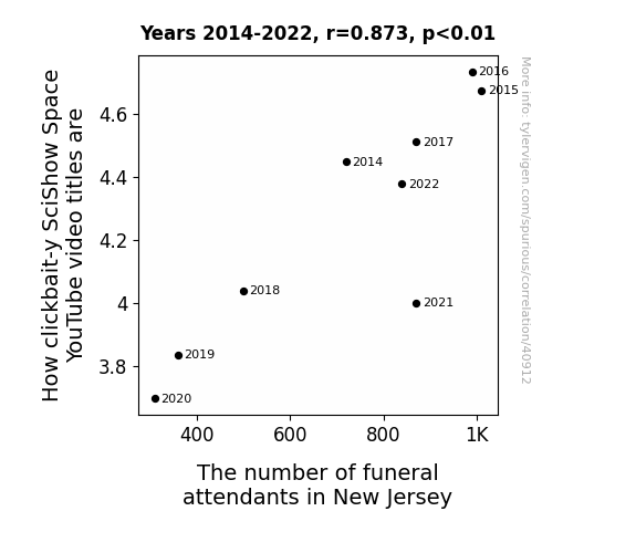 This means 76.1% of the change in the one variable (i.e., The number of funeral attendants in New Jersey) is predictable based on the change in the other (i.e., How clickbait-y SciShow Space YouTube video titles are) over the 9 years from 2014 through 2022.