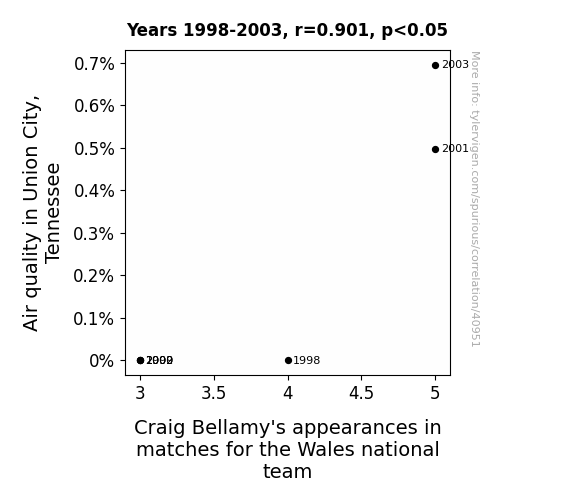 This means 81.2% of the change in the one variable (i.e., Craig Bellamy's appearances in matches for the Wales national team) is predictable based on the change in the other (i.e., Air quality in Union City, Tennessee) over the 6 years from 1998 through 2003.