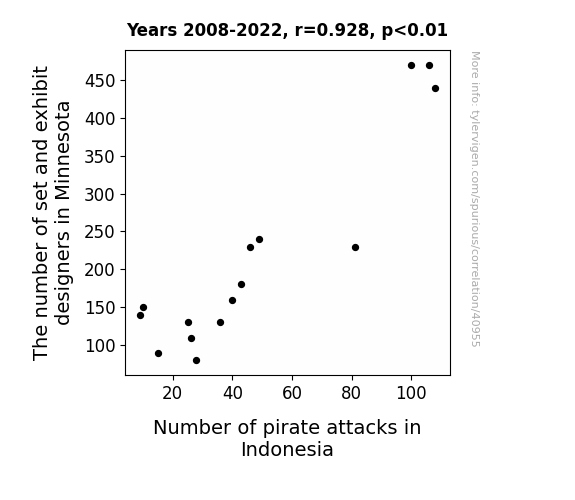 This means 86.2% of the change in the one variable (i.e., Number of pirate attacks in Indonesia) is predictable based on the change in the other (i.e., The number of set and exhibit designers in Minnesota) over the 15 years from 2008 through 2022.