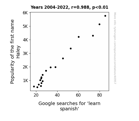 This means 97.7% of the change in the one variable (i.e., Google searches for 'learn spanish') is predictable based on the change in the other (i.e., Popularity of the first name Haley) over the 19 years from 2004 through 2022.