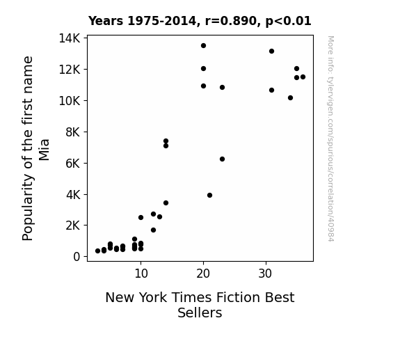 This means 79.2% of the change in the one variable (i.e., New York Times Fiction Best Sellers) is predictable based on the change in the other (i.e., Popularity of the first name Mia) over the 40 years from 1975 through 2014.