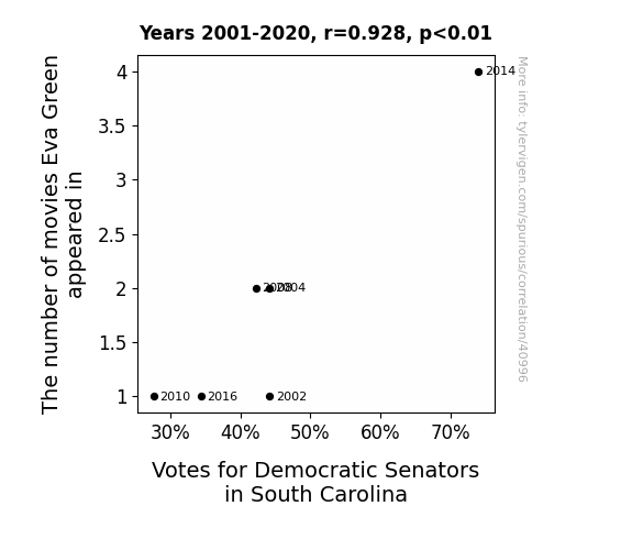 This means 86.2% of the change in the one variable (i.e., Votes for Democratic Senators in South Carolina) is predictable based on the change in the other (i.e., The number of movies Eva Green appeared in) over the 6 years from 2001 through 2020.