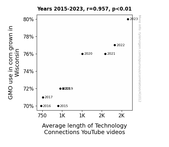 This means 91.6% of the change in the one variable (i.e., Average length of Technology Connections YouTube videos) is predictable based on the change in the other (i.e., GMO use in corn grown in Wisconsin) over the 9 years from 2015 through 2023.