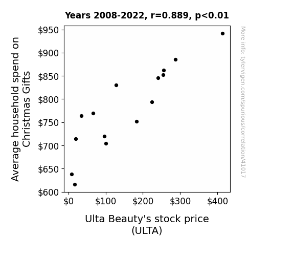 This means 79% of the change in the one variable (i.e., Ulta Beauty's stock price (ULTA)) is predictable based on the change in the other (i.e., Average household spend on Christmas Gifts) over the 15 years from 2008 through 2022.