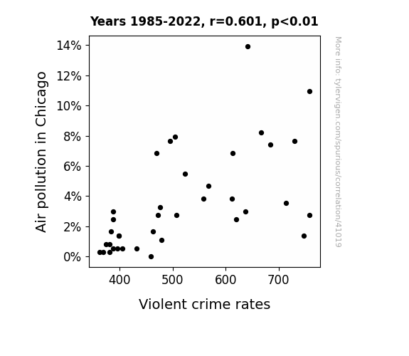 This means 36.2% of the change in the one variable (i.e., Violent crime rates) is predictable based on the change in the other (i.e., Air pollution in Chicago) over the 38 years from 1985 through 2022.