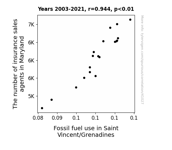 This means 89.1% of the change in the one variable (i.e., Fossil fuel use in Saint Vincent/Grenadines) is predictable based on the change in the other (i.e., The number of insurance sales agents in Maryland) over the 19 years from 2003 through 2021.