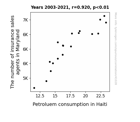 This means 84.6% of the change in the one variable (i.e., Petroluem consumption in Haiti) is predictable based on the change in the other (i.e., The number of insurance sales agents in Maryland) over the 19 years from 2003 through 2021.