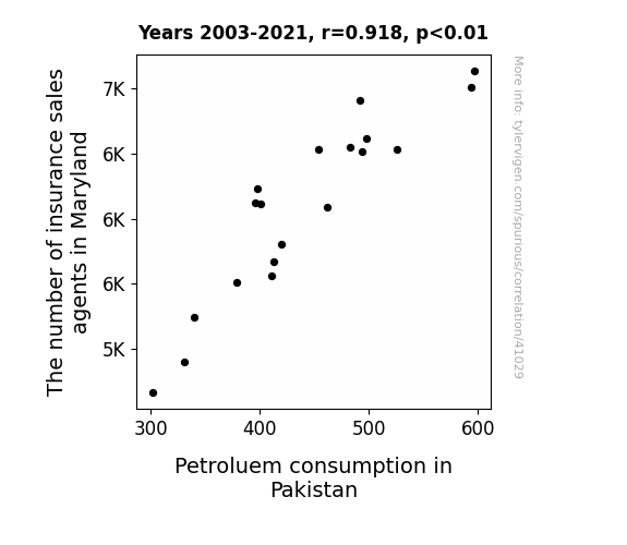 This means 84.4% of the change in the one variable (i.e., Petroluem consumption in Pakistan) is predictable based on the change in the other (i.e., The number of insurance sales agents in Maryland) over the 19 years from 2003 through 2021.