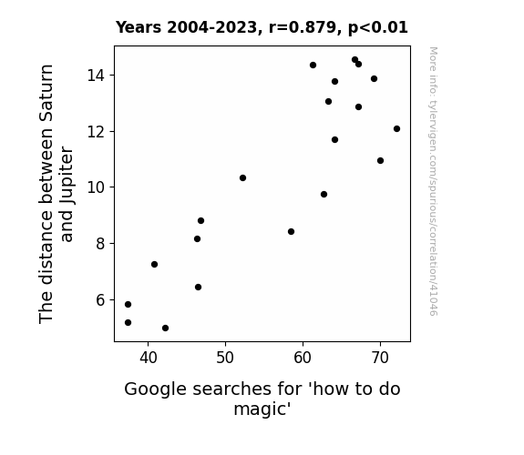 This means 77.2% of the change in the one variable (i.e., Google searches for 'how to do magic') is predictable based on the change in the other (i.e., The distance between Saturn and Jupiter) over the 20 years from 2004 through 2023.