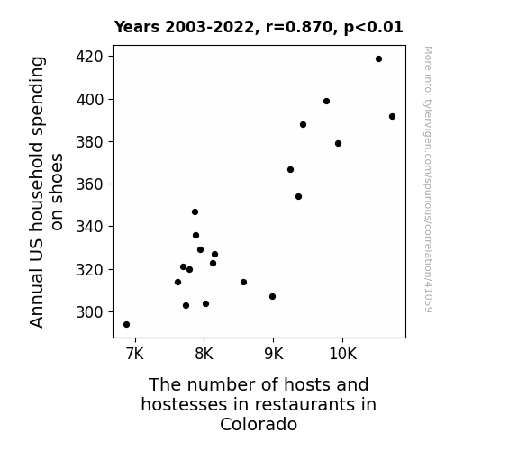 This means 75.7% of the change in the one variable (i.e., The number of hosts and hostesses in restaurants in Colorado) is predictable based on the change in the other (i.e., Annual US household spending on shoes) over the 20 years from 2003 through 2022.
