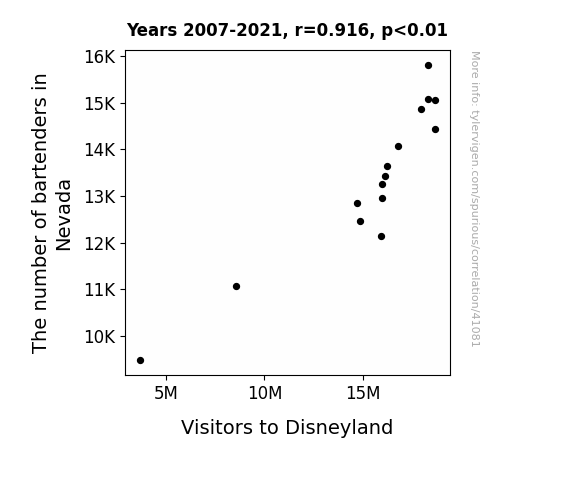 This means 84% of the change in the one variable (i.e., Visitors to Disneyland) is predictable based on the change in the other (i.e., The number of bartenders in Nevada) over the 15 years from 2007 through 2021.