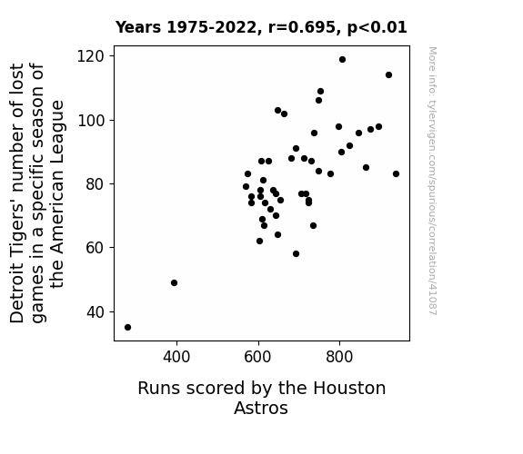 This means 48.3% of the change in the one variable (i.e., Runs scored by the Houston Astros) is predictable based on the change in the other (i.e., Detroit Tigers' number of lost games in a specific season of the American League) over the 48 years from 1975 through 2022.