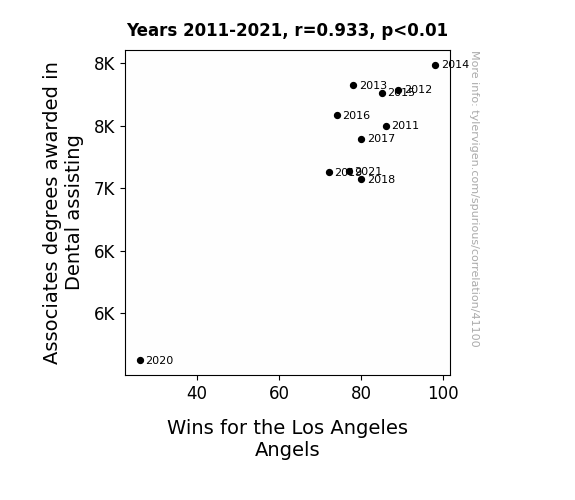 This means 87% of the change in the one variable (i.e., Wins for the Los Angeles Angels) is predictable based on the change in the other (i.e., Associates degrees awarded in Dental assisting) over the 11 years from 2011 through 2021.