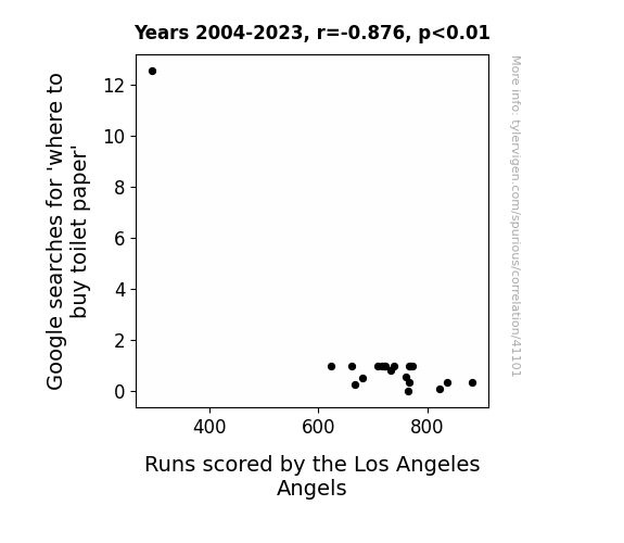 This means 76.8% of the change in the one variable (i.e., Runs scored by the Los Angeles Angels) is predictable based on the change in the other (i.e., Google searches for 'where to buy toilet paper') over the 20 years from 2004 through 2023.