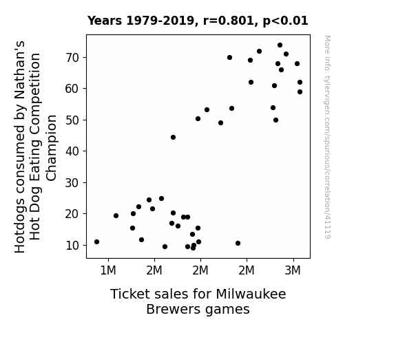 This means 64.1% of the change in the one variable (i.e., Ticket sales for Milwaukee Brewers games) is predictable based on the change in the other (i.e., Hotdogs consumed by Nathan's Hot Dog Eating Competition Champion) over the 41 years from 1979 through 2019.