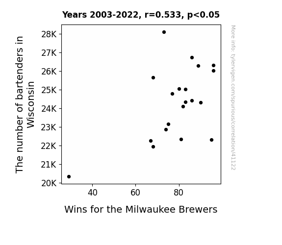 This means 28.5% of the change in the one variable (i.e., Wins for the Milwaukee Brewers) is predictable based on the change in the other (i.e., The number of bartenders in Wisconsin) over the 20 years from 2003 through 2022.