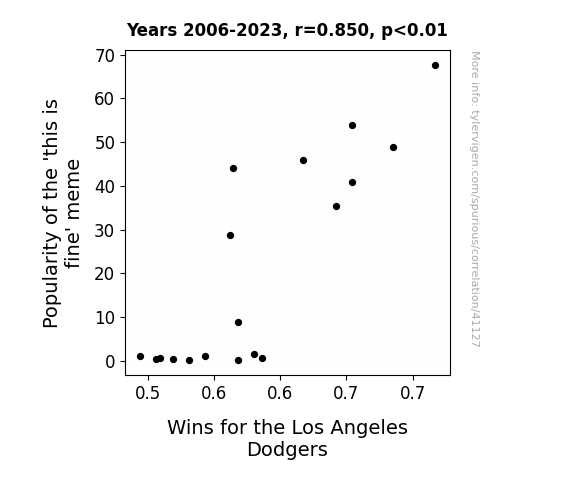 This means 72.3% of the change in the one variable (i.e., Wins for the Los Angeles Dodgers) is predictable based on the change in the other (i.e., Popularity of the 'this is fine' meme) over the 18 years from 2006 through 2023.