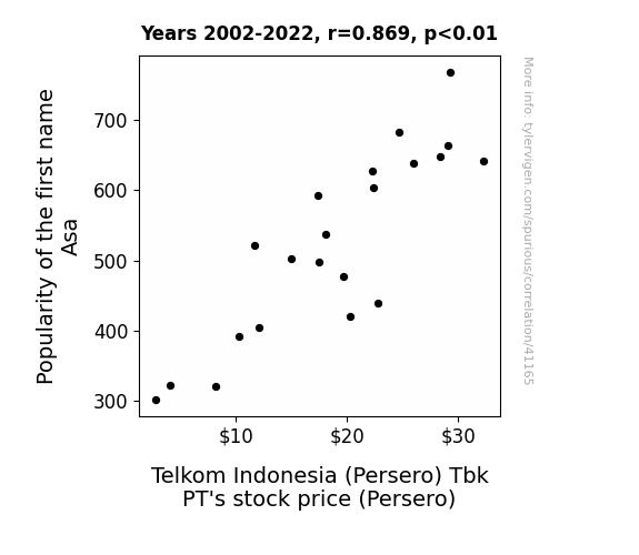 This means 75.5% of the change in the one variable (i.e., Telkom Indonesia (Persero) Tbk PT's stock price (Persero)) is predictable based on the change in the other (i.e., Popularity of the first name Asa) over the 21 years from 2002 through 2022.