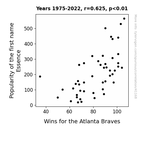 This means 39% of the change in the one variable (i.e., Wins for the Atlanta Braves) is predictable based on the change in the other (i.e., Popularity of the first name Essence) over the 48 years from 1975 through 2022.