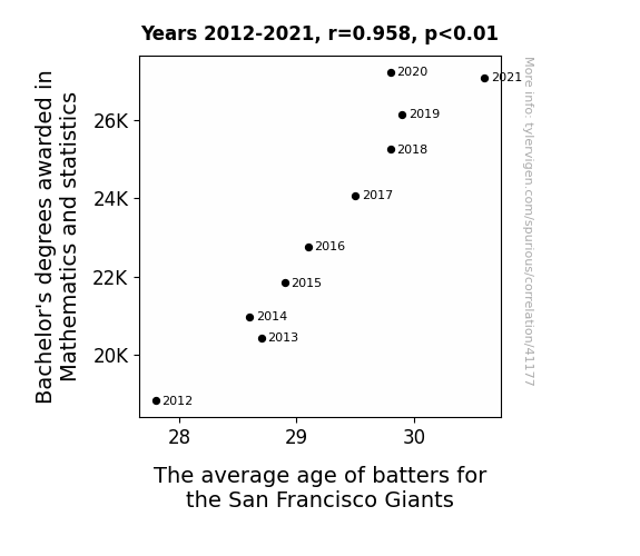 This means 91.8% of the change in the one variable (i.e., The average age of batters for the San Francisco Giants) is predictable based on the change in the other (i.e., Bachelor's degrees awarded in Mathematics and statistics) over the 10 years from 2012 through 2021.