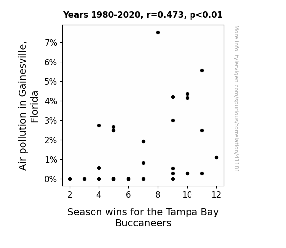 This means 22.3% of the change in the one variable (i.e., Season wins for the Tampa Bay Buccaneers) is predictable based on the change in the other (i.e., Air pollution in Gainesville, Florida) over the 41 years from 1980 through 2020.
