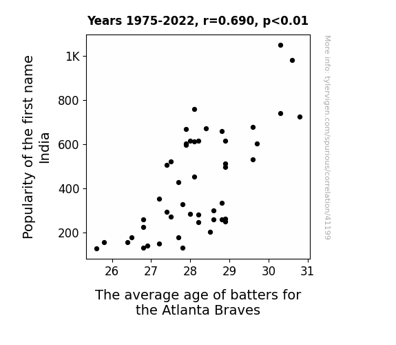 This means 47.5% of the change in the one variable (i.e., The average age of batters for the Atlanta Braves) is predictable based on the change in the other (i.e., Popularity of the first name India) over the 48 years from 1975 through 2022.