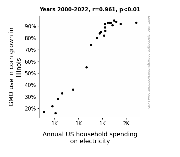 This means 92.3% of the change in the one variable (i.e., Annual US household spending on electricity) is predictable based on the change in the other (i.e., GMO use in corn grown in Illinois) over the 23 years from 2000 through 2022.