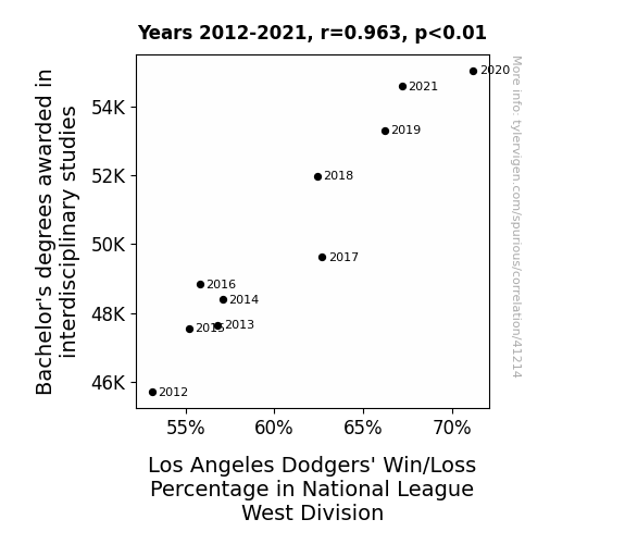 This means 92.8% of the change in the one variable (i.e., Los Angeles Dodgers' Win/Loss Percentage in National League West Division) is predictable based on the change in the other (i.e., Bachelor's degrees awarded in interdisciplinary studies) over the 10 years from 2012 through 2021.
