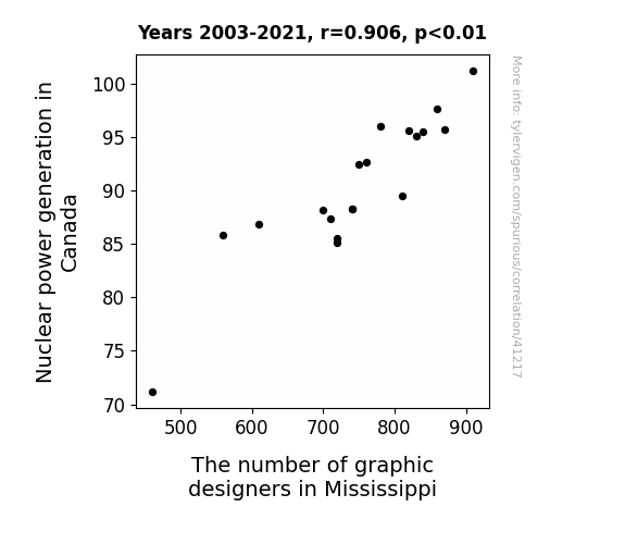 This means 82.2% of the change in the one variable (i.e., The number of graphic designers in Mississippi) is predictable based on the change in the other (i.e., Nuclear power generation in Canada) over the 19 years from 2003 through 2021.