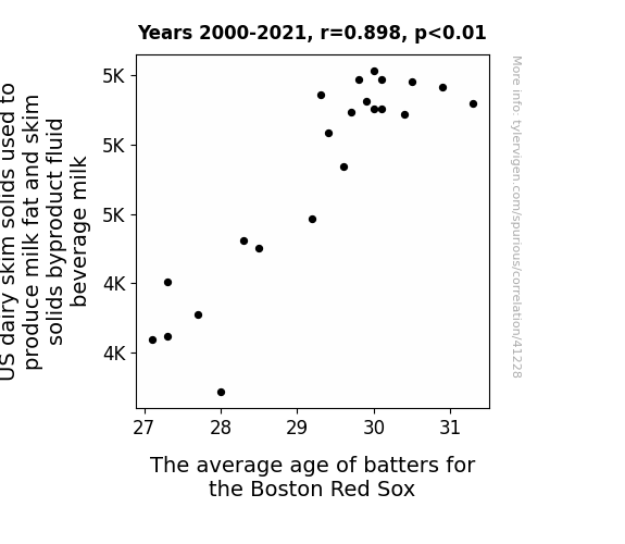 This means 80.7% of the change in the one variable (i.e., The average age of batters for the Boston Red Sox) is predictable based on the change in the other (i.e., US dairy skim solids used to produce milk fat and skim solids byproduct fluid beverage milk) over the 22 years from 2000 through 2021.