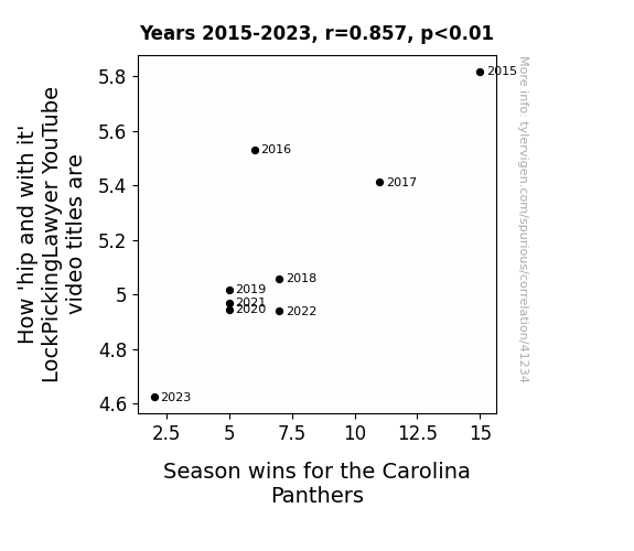 This means 73.4% of the change in the one variable (i.e., Season wins for the Carolina Panthers) is predictable based on the change in the other (i.e., How 'hip and with it' LockPickingLawyer YouTube video titles are) over the 9 years from 2015 through 2023.
