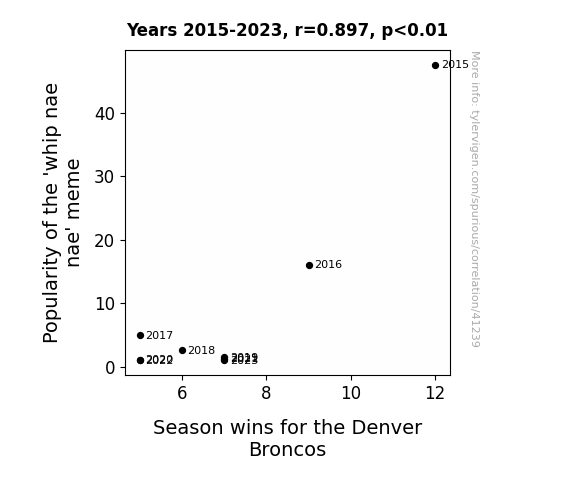 This means 80.4% of the change in the one variable (i.e., Season wins for the Denver Broncos) is predictable based on the change in the other (i.e., Popularity of the 'whip nae nae' meme) over the 9 years from 2015 through 2023.