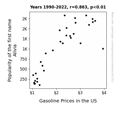 This means 74.4% of the change in the one variable (i.e., Gasoline Prices in the US) is predictable based on the change in the other (i.e., Popularity of the first name Alivia) over the 33 years from 1990 through 2022.