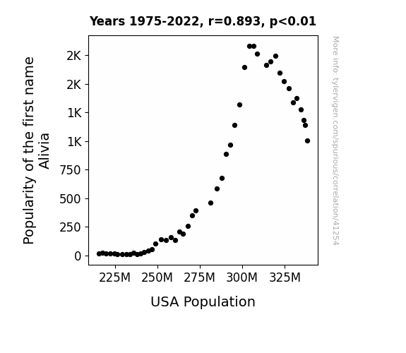 This means 79.7% of the change in the one variable (i.e., USA Population) is predictable based on the change in the other (i.e., Popularity of the first name Alivia) over the 48 years from 1975 through 2022.